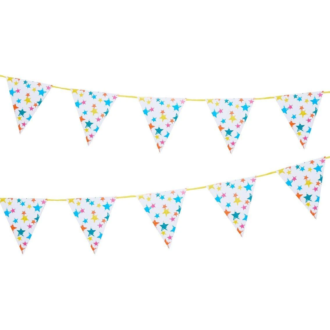 | This paper star bunting features 12 triangle pennants with a colourful star design. Perfect for hanging on the wall or in the garden as decoration at your next birthday, picnic, BBQ or kid’s party. You could even use as bunting for a kid’s bedroom to add a pop of colour to their room decor. This bunting decoration can be reused on many occasions and eventually recycled in your home recycling bin. Pair with our ‘Birthday Brights’ range for matching star party tableware Size: 3m (10ft) with 12 triangle pennants |