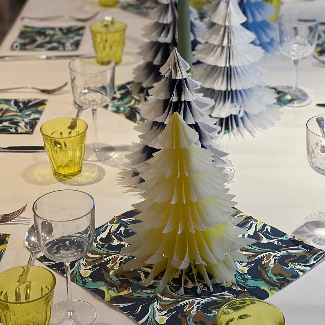 Add a modern twist to traditional Christmas decorations with these blue and yellow winter shades. Use these honeycomb Christmas trees to a mantel or coffee table for a sparkling addition to your annual decorations. After Christmas Day, carefully fold them away and store for next year.