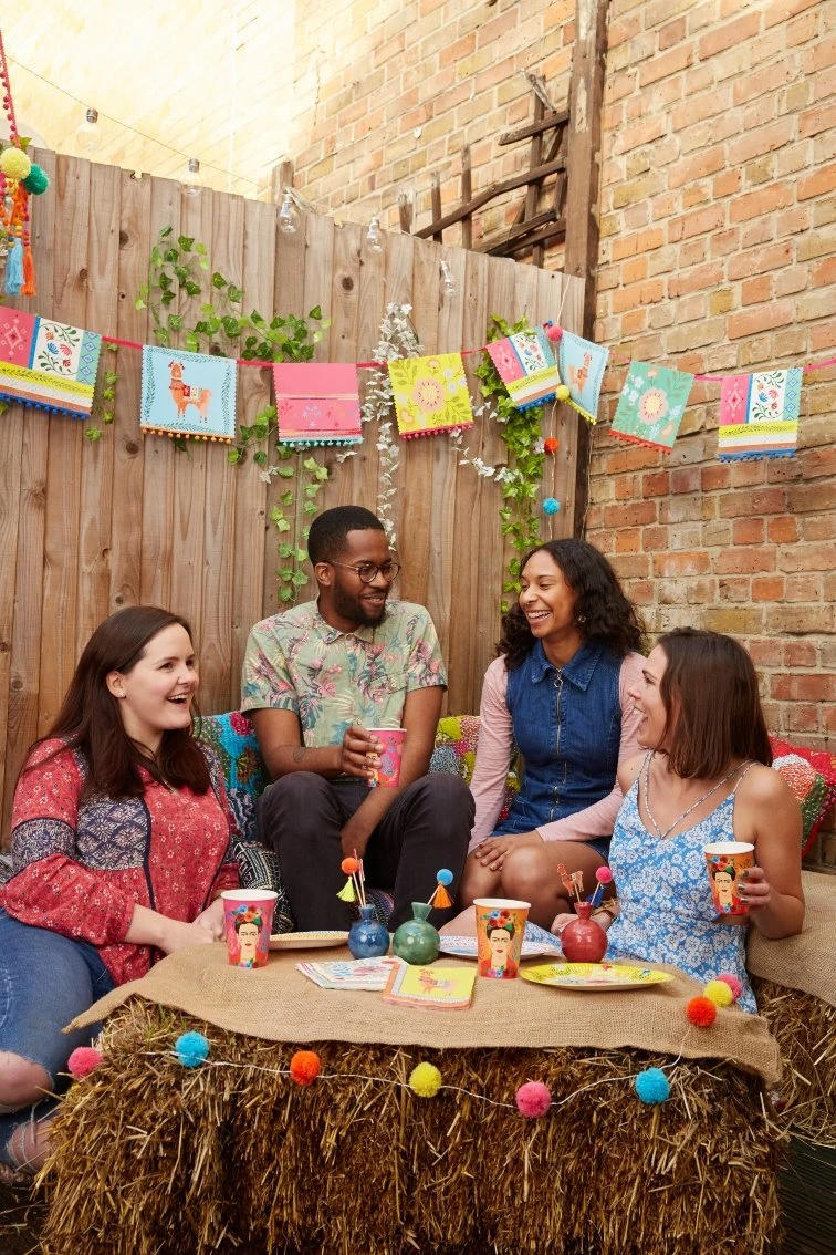 Colourful Mexican paper bunting with llama, boho floral print and fabric pom pom trim. Mexican party decorations for Cinco De Mayo, garden party or boho birthday party. Hang this garland on the walls, from the ceiling or between trees. A hanging party decoration ideal for decorating your home or garden.