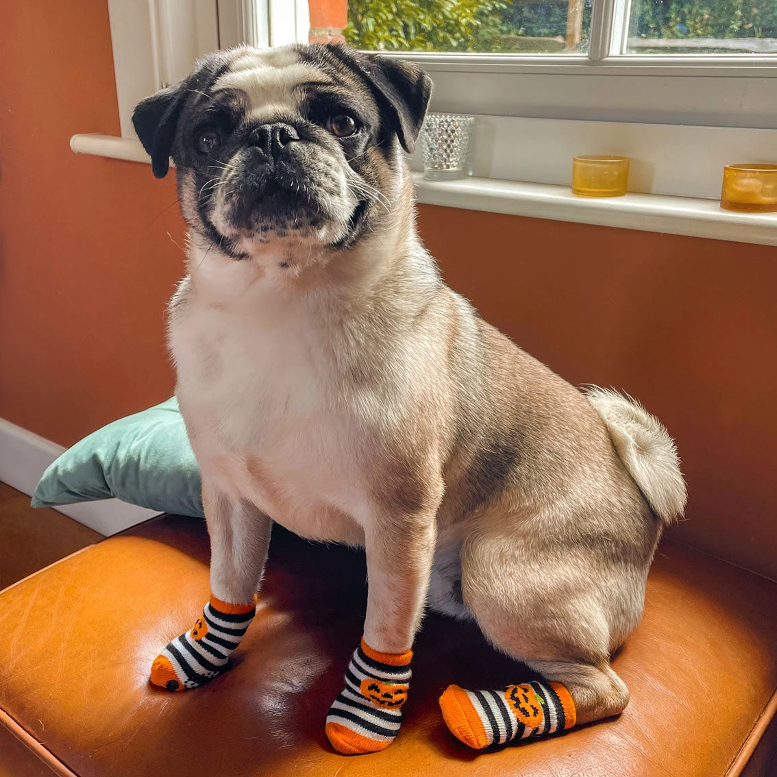 Don’t let your dog miss out on the Halloween fun! Get the whole family dressed up for trick or treating with these Halloween dog socks. Each sock is stitched with black and white stripes and a jack o lantern pumpkin, making for a cute Halloween dog costume. With anti-slip grips on each sock, your dog will be warm and ready to take on the streets in style.