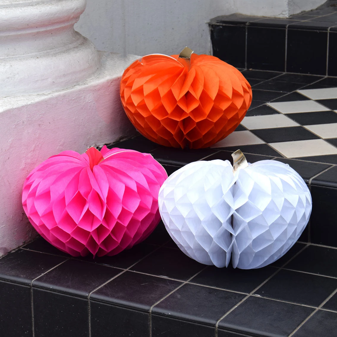 Frightfully fun, these pumpkin decorations are perfect for decorating your front porch or creating a centrepiece for your Halloween table. Coming in a pack of 3 with pink, orange and white pumpkins, these paper honeycomb decorations are easy to assemble, simply unfold and secure together with the paperclip to create the pumpkin shape.