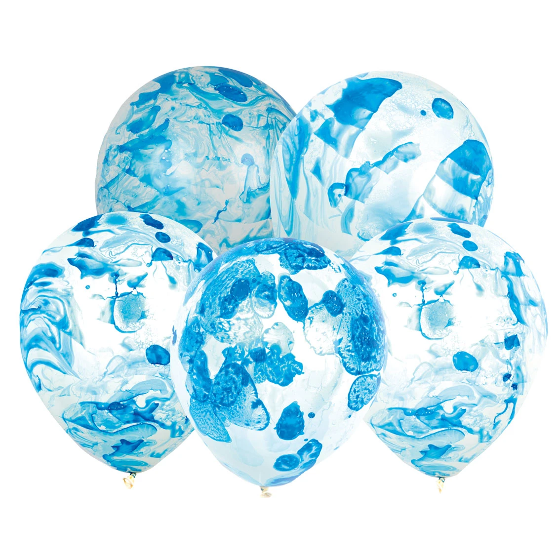 Bring a splash of sophistication to your party with these eye-catching blue balloons. With their unique, blue marble design they make a perfect party piece for a birthday party, baby shower or blue party theme. Use the included paper ribbon to tie them to doors, and chairs or decorate the ceiling to catch the eye of passing guests.