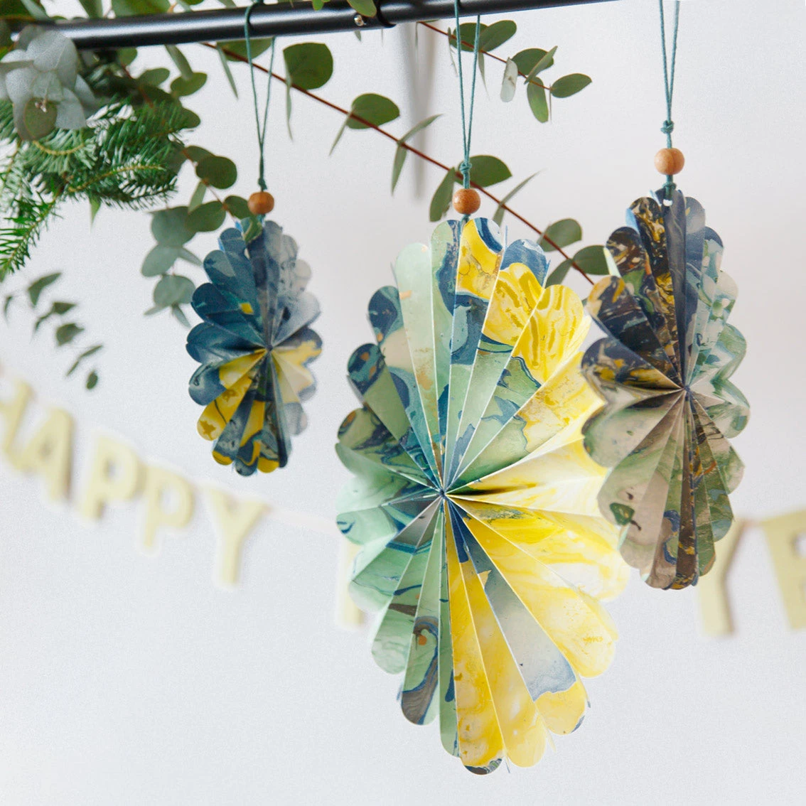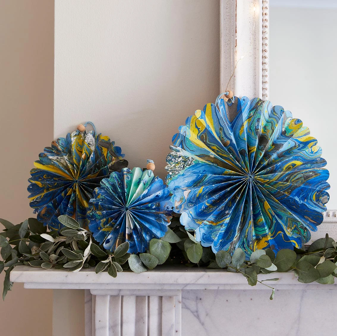 Create a sense of modern and stylish elegance in your home with these blue marble hanging card decorations. Hand marbled with blue, yellow and metallic dyes, no two decorations are exactly the same. Comes in a pack of 3 different sizes, simply open out each paper fan and secure using the integrated magnets to reveal a wonderful marble print design.