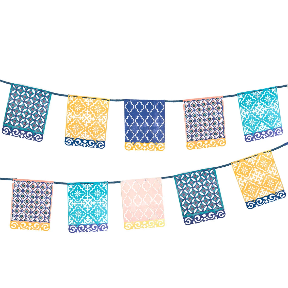 Transport your guests to the colourful souks of Marrakesh with this Moroccan Souk Blue Paper Garland. Inspired by the brightly patterned tiles found piled high in the country’s bazars, this 12 pennant garland will add a riot of colour and print to special celebrations.