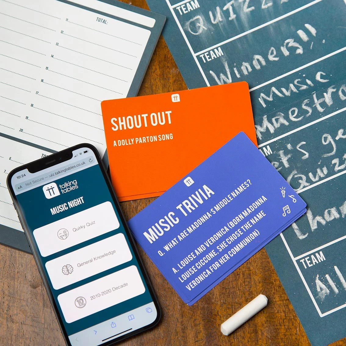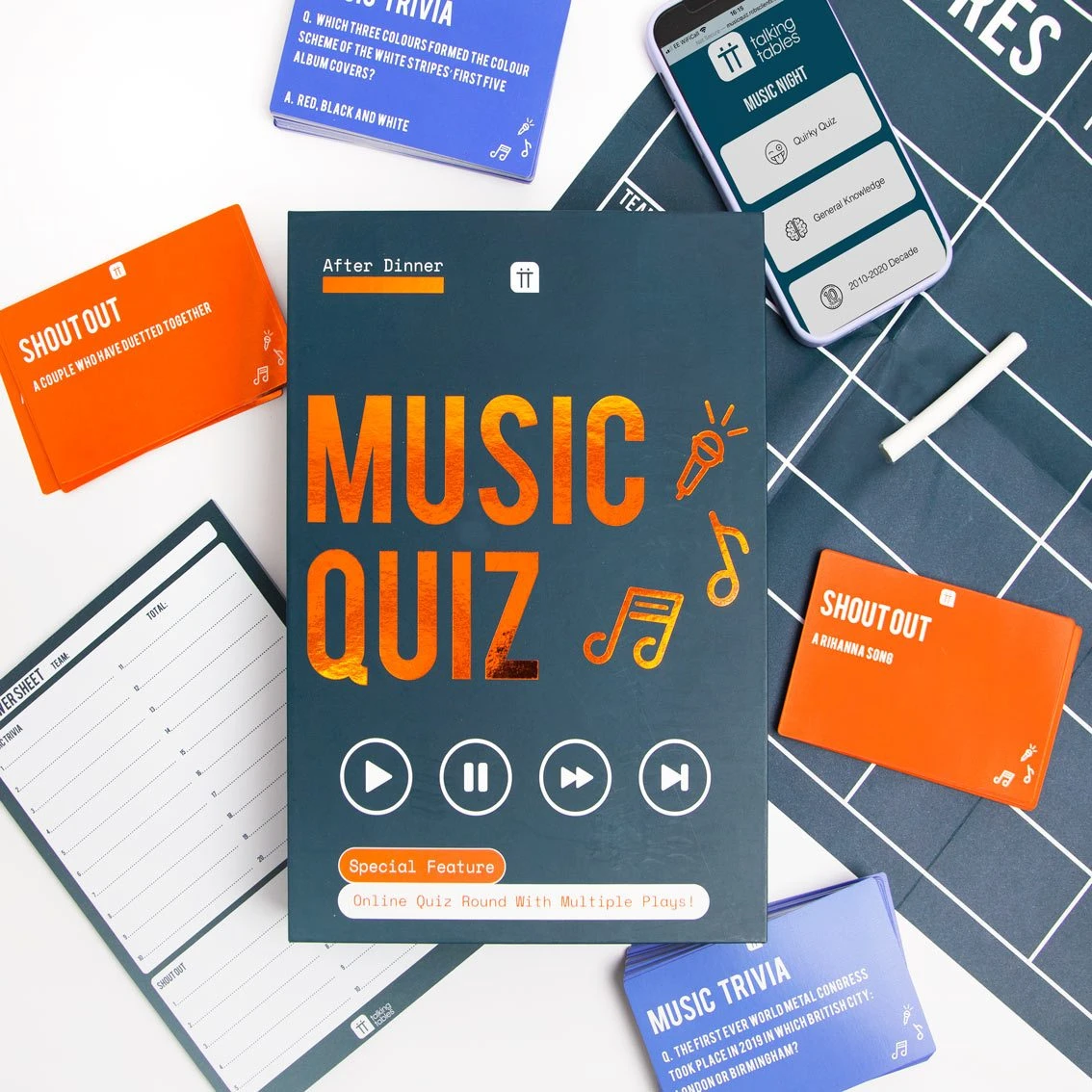 Music Trivia Quiz game by Talking Tables. Whether you choose to play gathered around the dining table or lounging in the living room, now you can host the ultimate music quiz from the comfort of your own home!