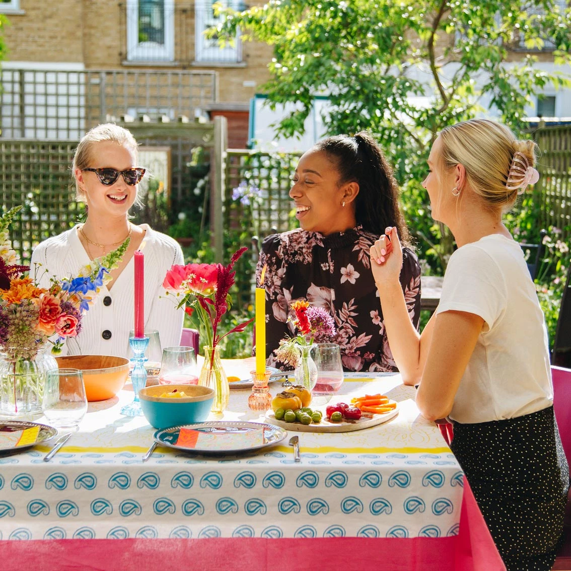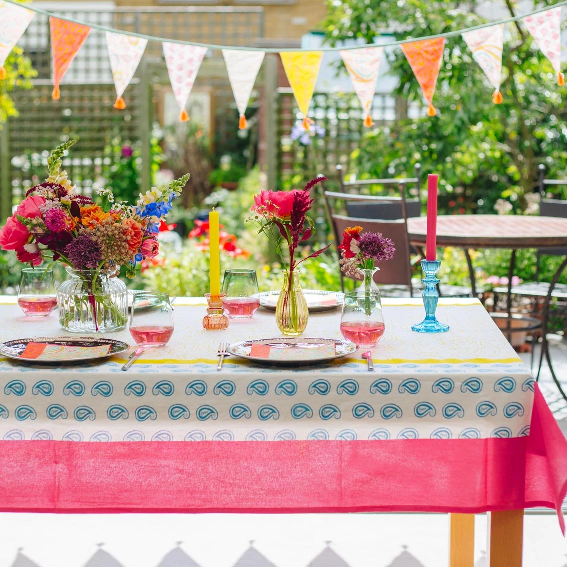 Our paisley fabric tablecloth is made from sustainably sourced 100% cotton and is inspired by hand block printing from India. Complement this bright design with summery tablescape items from our boho range like the orange mango wood bowl and our colourful boho glass jug.