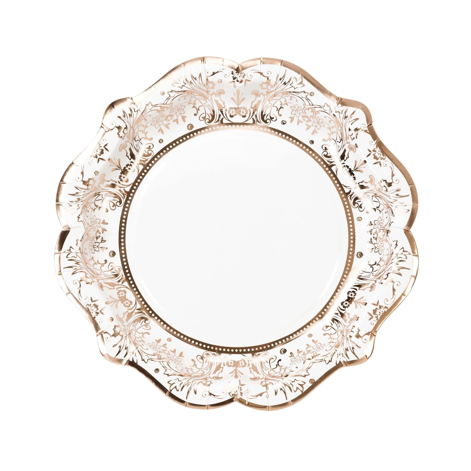 Mix and match your vintage porcelain with this beautifully elegant range of rose gold paper partyware. A sophisticates range suitable for weddings, anniversaries and stylish buffets. Save your fine china and use these porcelain inspired paper plates for larger gatherings. 12 x paper plates in 2 designs. Diameter: 23cm