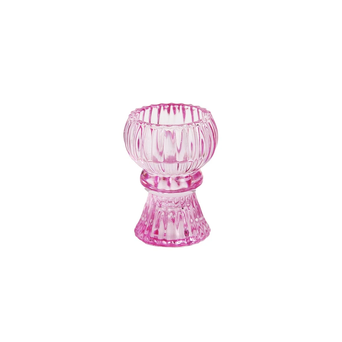 Delicate and refined, our small pink glass candle holder might be just the touch of colour you need for your romantic meal or wedding celebration. A versatile design; this colourful piece can hold dinner candles or tealights and even serve as a bud vase depending on which way up you have it. Place a few at intervals down the centre of your dining table or around the room at varying heights to create different levels of light.