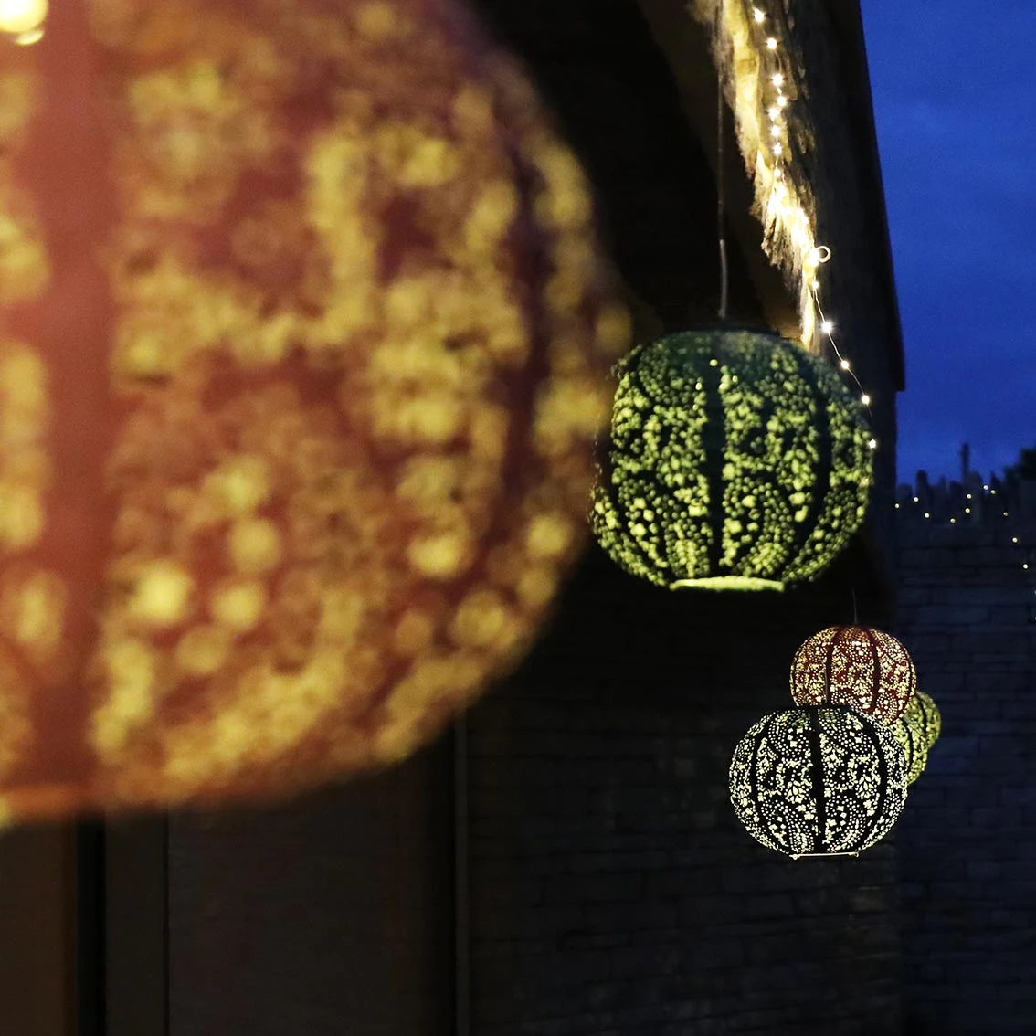 By day, a beautiful outdoor decoration reminiscent of Chinese paper lanterns; by night a warm light source that’s perfect for setting a mood with no need to change batteries or plug into a wall. Hang these lace-like, dusky pink lanterns up in your garden or patio to illuminate a summer dinner party or barbeque. In winter, use them to light up your favourite garden seat and gaze up at the stars with a cozy cup of hot chocolate. A cut-out design means that you’ll be admiring the light as it casts paisley-shaped patterns across your lawn or tiles. Our outdoor solar lanterns also come in navy or teal blue colours.