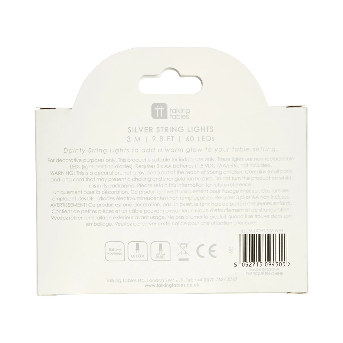 These dainty string lights will add a warm glow to your table setting or home décor. 3 meters in length and battery operated. Batteries not included.
