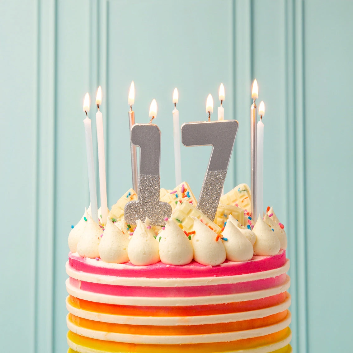 Our number birthday candles are also available in gold, blue and pink.