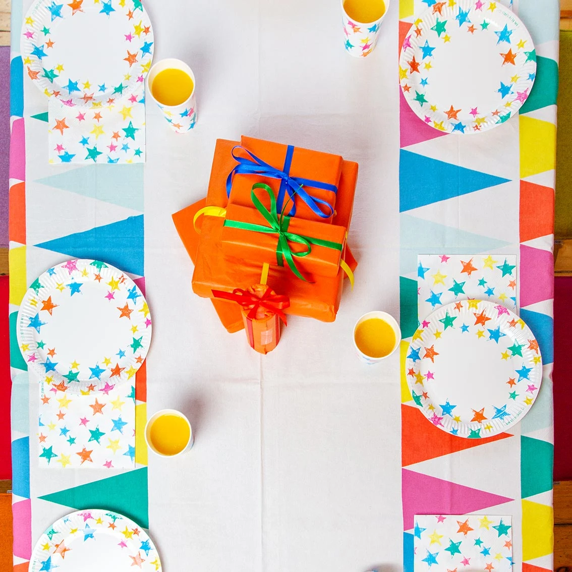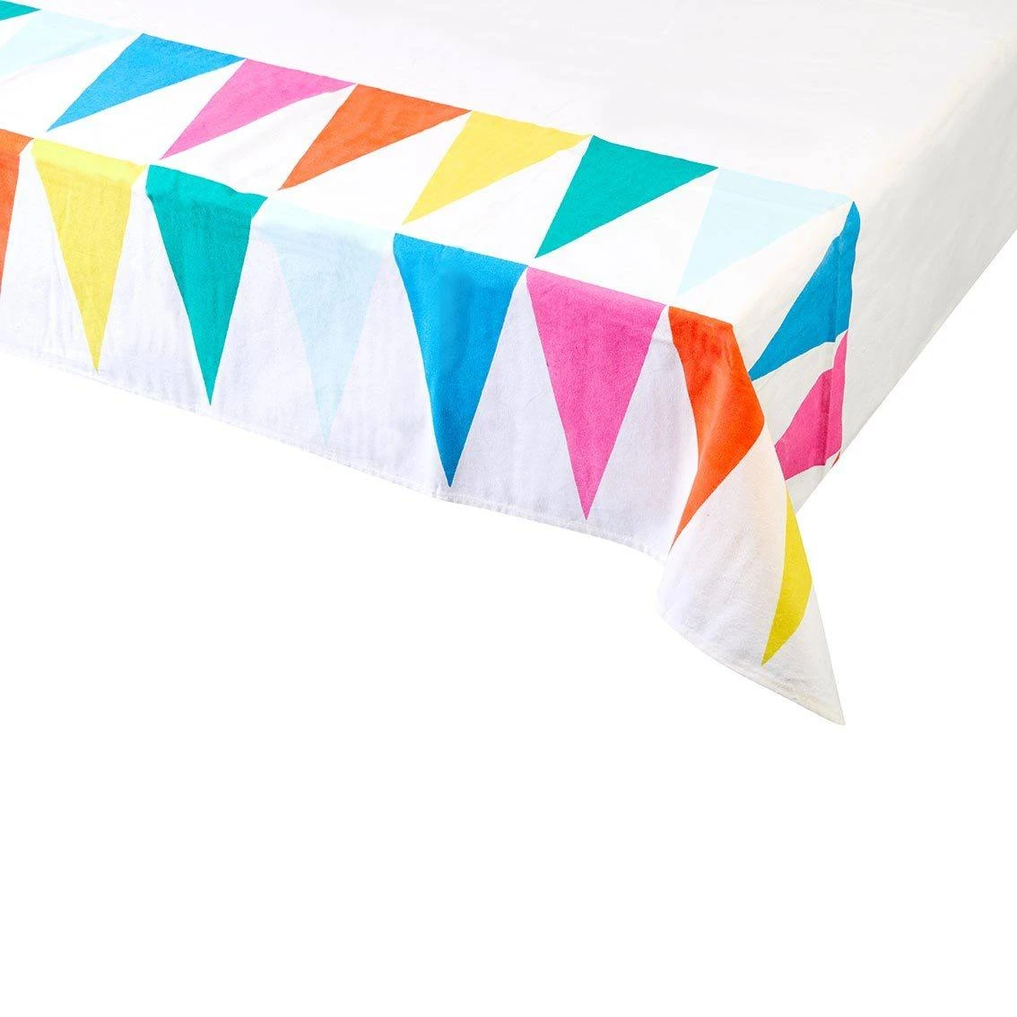 White Fabric Table Cover with Rainbow Bunting Design by Talking Tables. Made from 100% cotton, this rectangular tablecloth is reusable and machine washable. Perfect for a brightly coloured birthday party, kids party, picnic, summer gathering or pride celebration! Pair with our ‘Birthday Brights’ range for matching rainbow decorations, tableware and party supplies. Size: 200 x 140 cm (79 x 55 in).