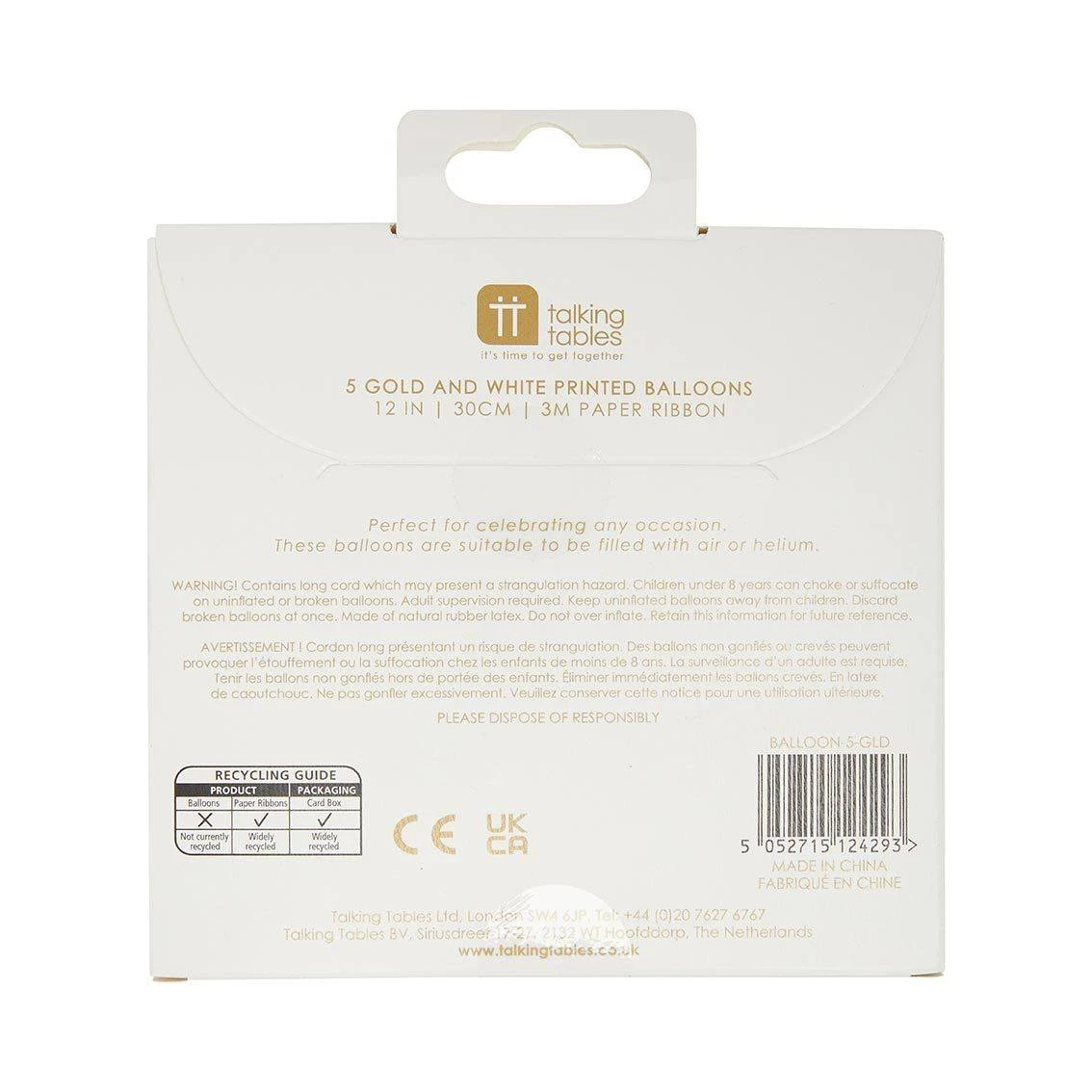 White and Gold Confetti Balloons by Talking Tables. Pack of 5 latex balloons with eye-catching printed confetti design. These balloons are suitable to be filled with air or helium. The perfect gold party decoration for a Birthday Party, Wedding, Anniversary, School Prom or other celebration. Also includes paper ribbon that can be attached to each balloon. Pair with our ‘Luxe Gold’ or ‘Party Porcelain’ range for matching gold party decorations, tableware and supplies. Size: 30cm (12in), 3m paper ribbon.