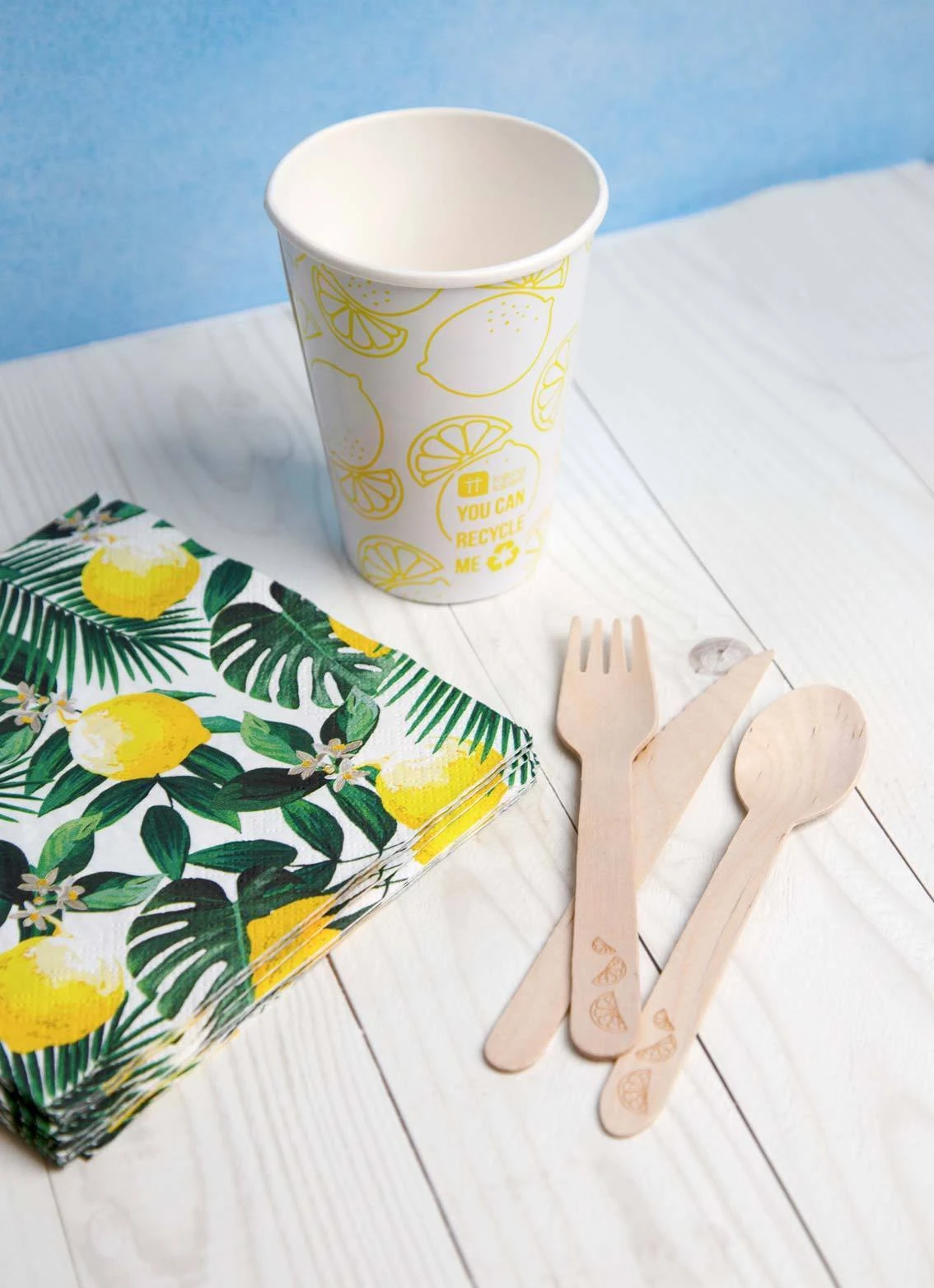 Eat sustainably in style with this wooden cutlery set. Made from sustainably sourced wood with a summery lemon design, this cutlery is disposable and biodegradable. After tucking into your meal, simply dispose of this eco-friendly tableware in your bin.